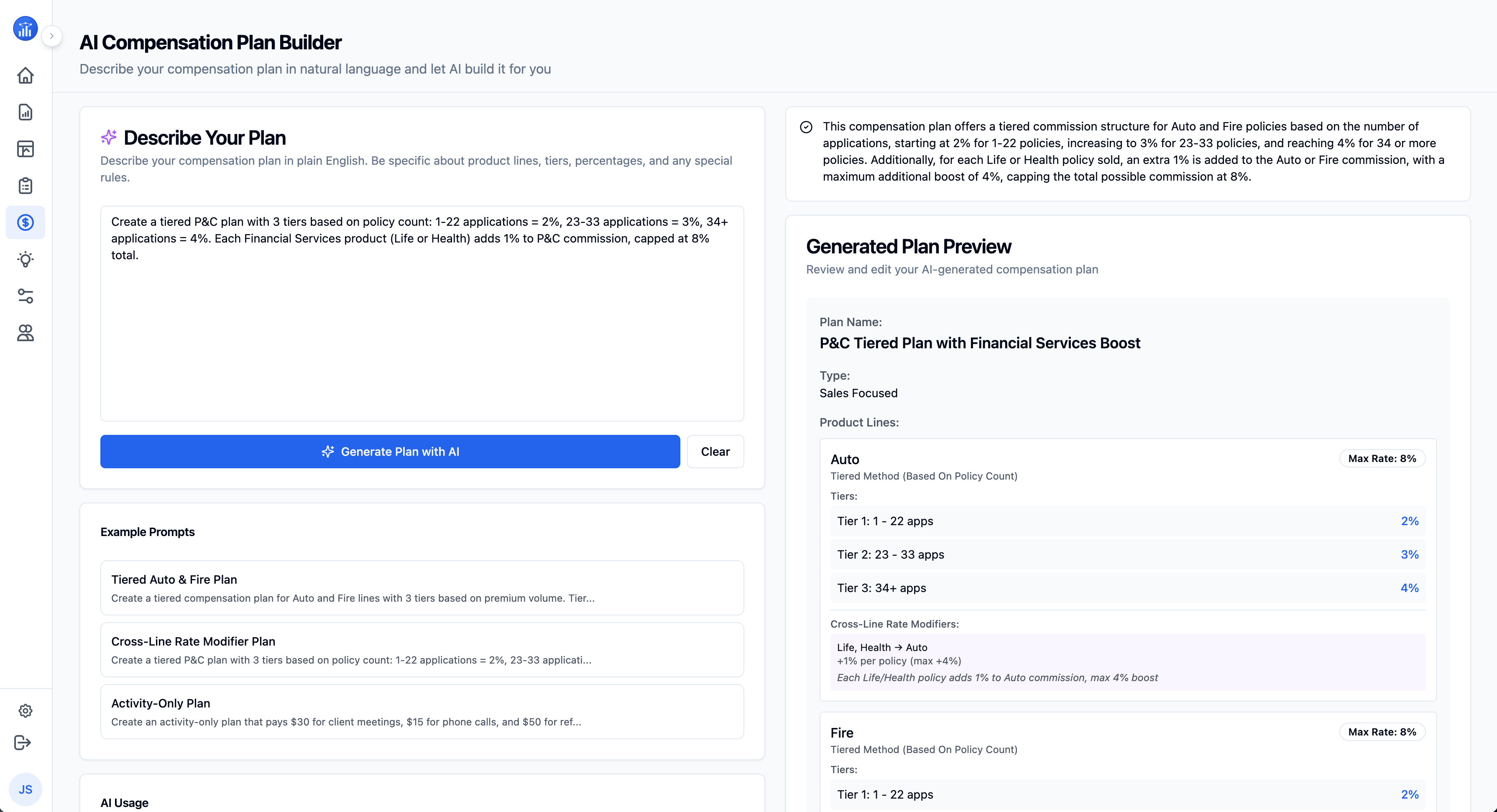 Generate compensation plans from natural language and get intelligent coaching insights tailored to your performance.