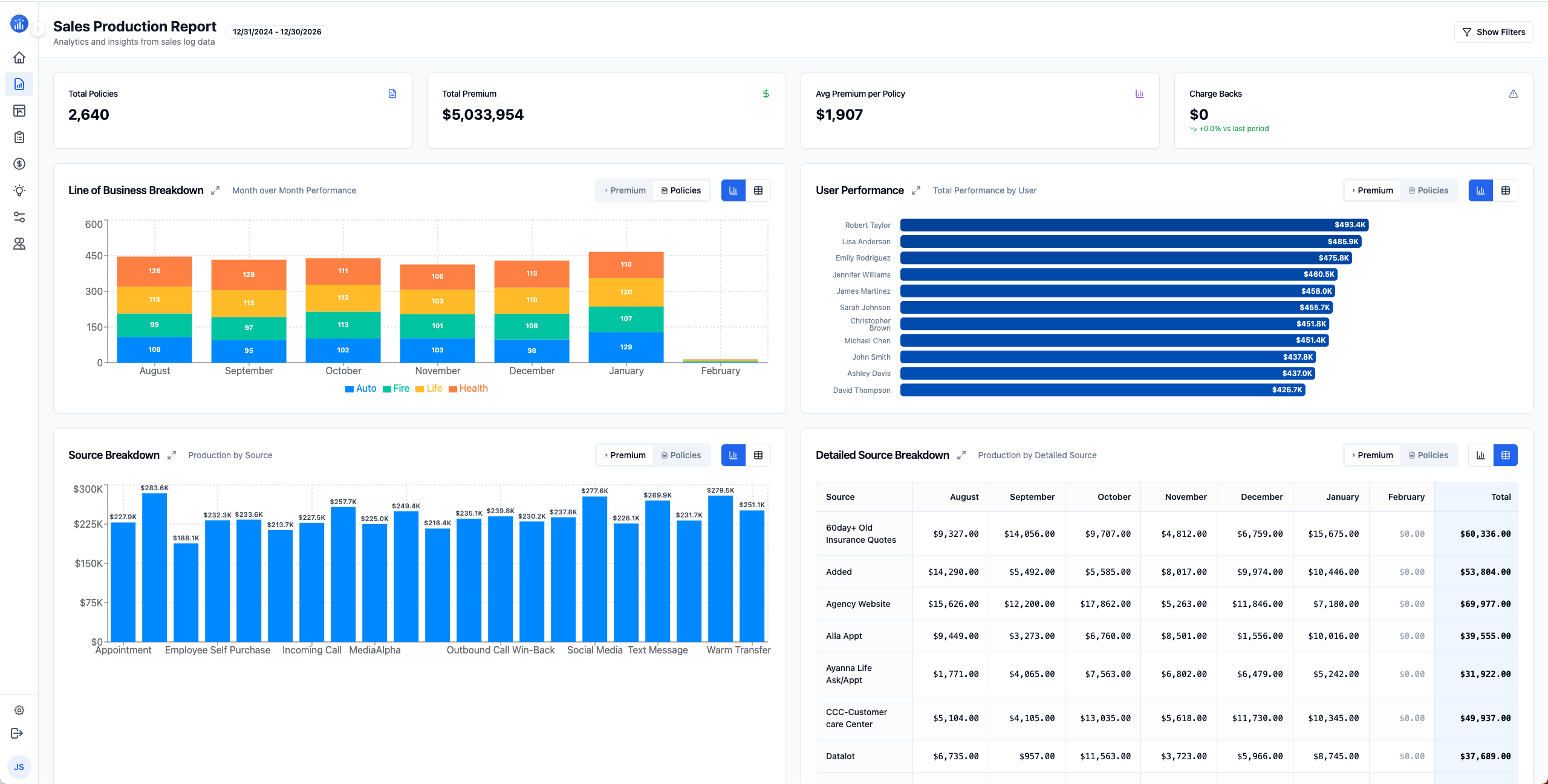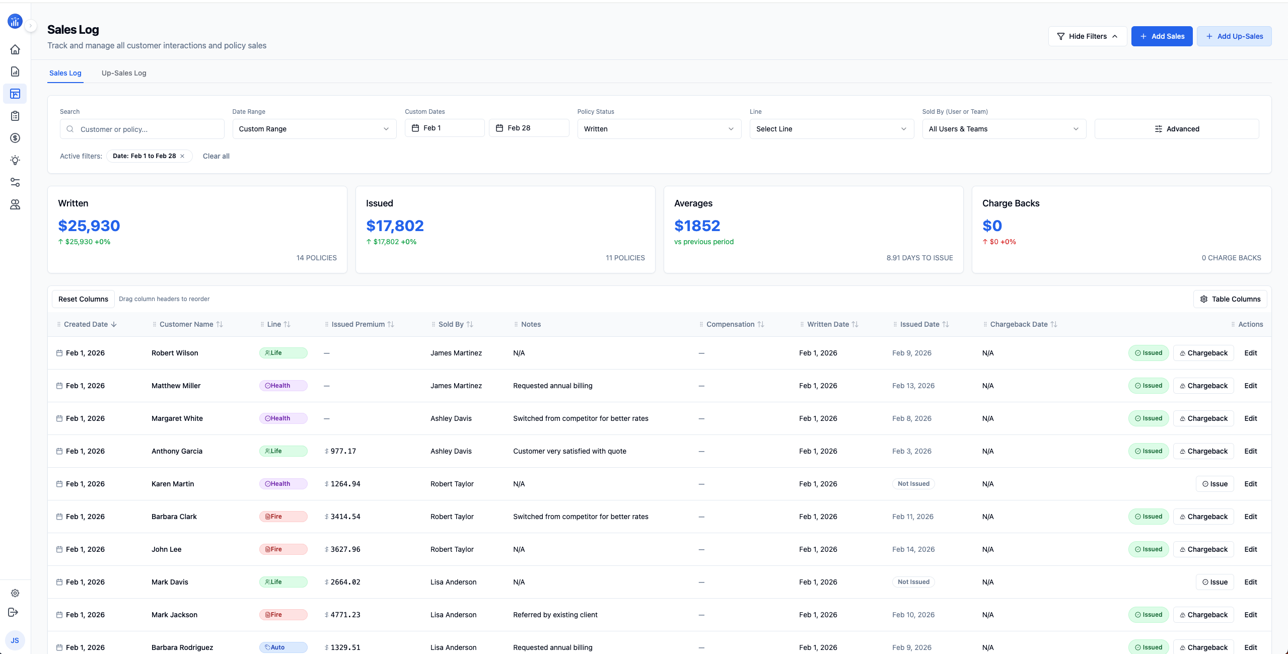 Track and manage all customer interactions and policy sales with powerful filtering and search capabilities.